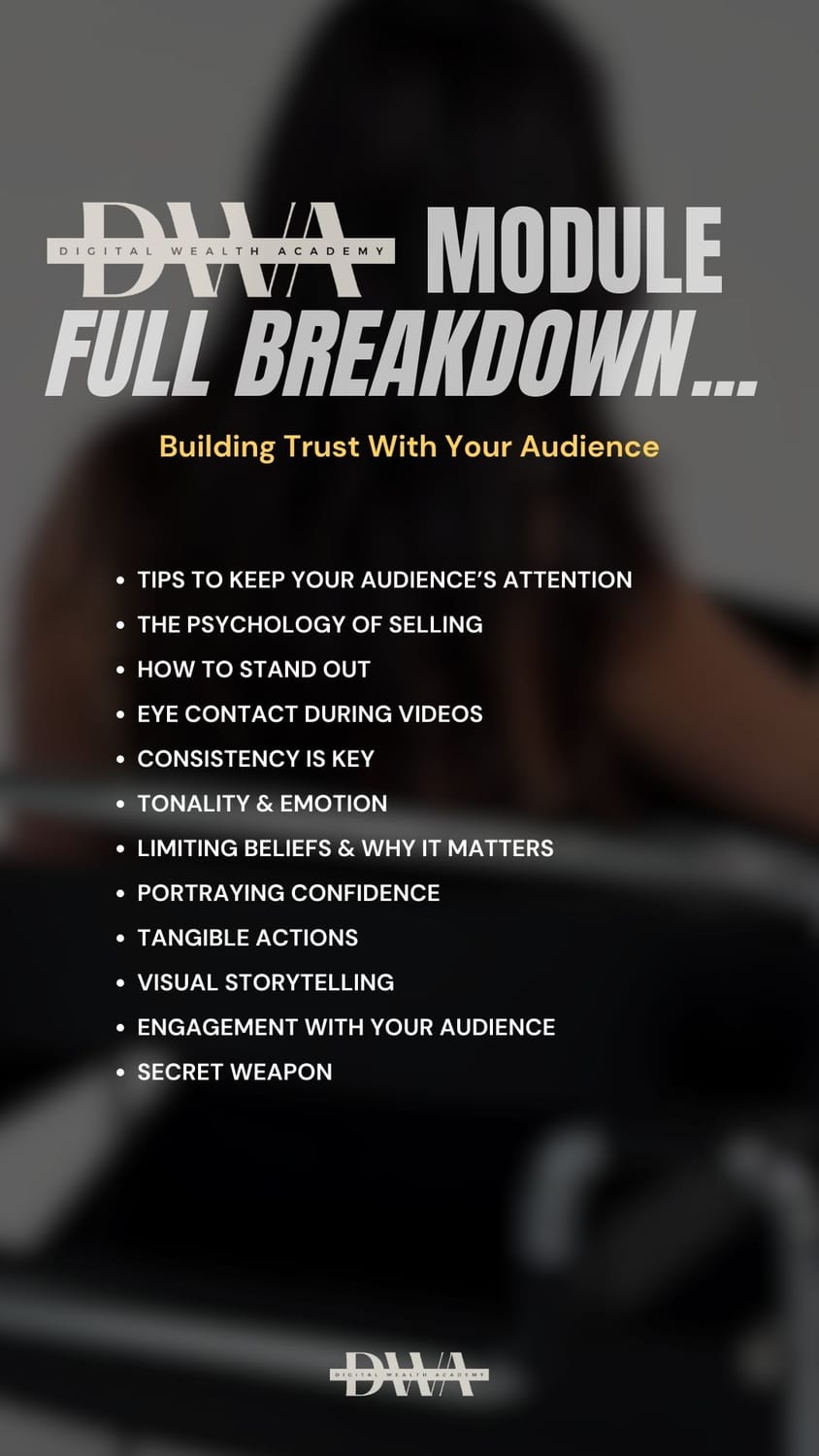 Learn how to promote The DWA course or any other product. This will teach you how to quickly grow your audience and make sales via social media marketing.